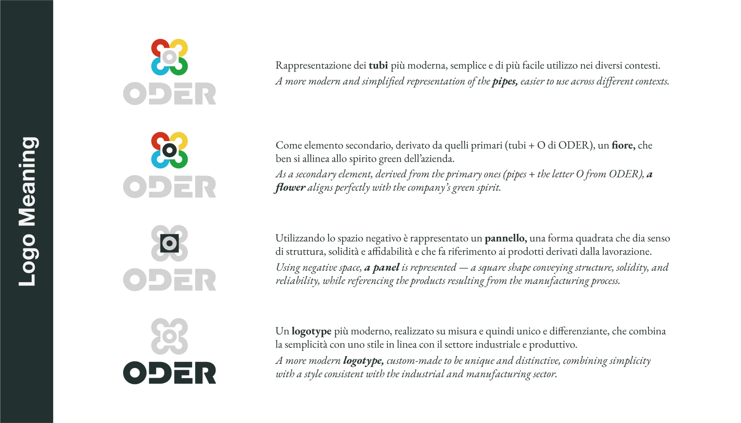 Questo concept personale di identità visiva lavora soprattutto su una trasformazione di linguaggio: da un’immagine tecnica ma un po’ datata, Oder viene ripensata come industria contemporanea, solida e con un maggior focus sulla sostenibilità. Il nuovo sistema unifica tubi, pannelli e lavorazioni in un simbolo modulare e pulito, più flessibile sui canali digitali e capace di raccontare in modo immediato la doppia anima dell’azienda: produzione industriale e attenzione alla rigenerazione delle materie plastiche.