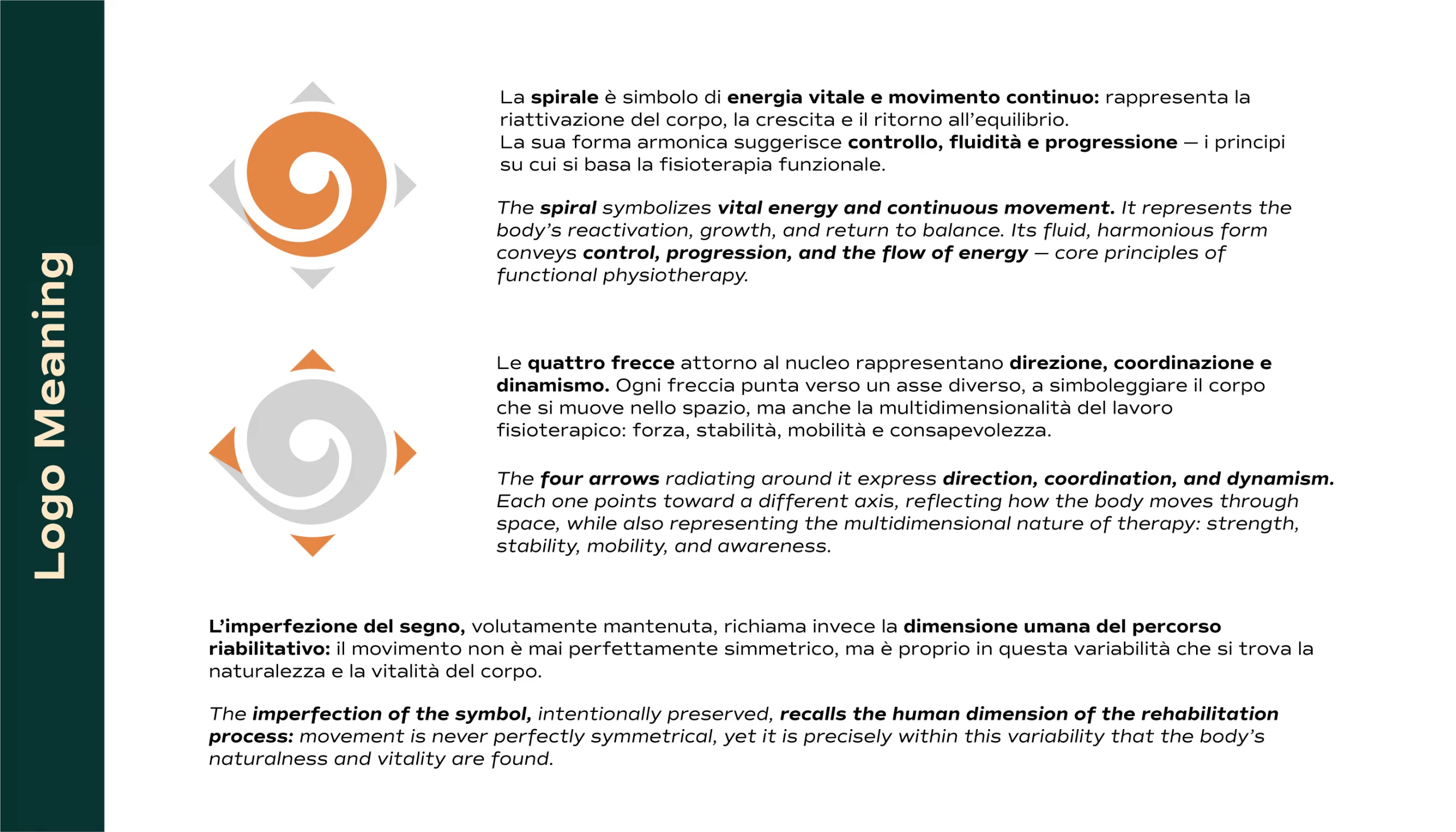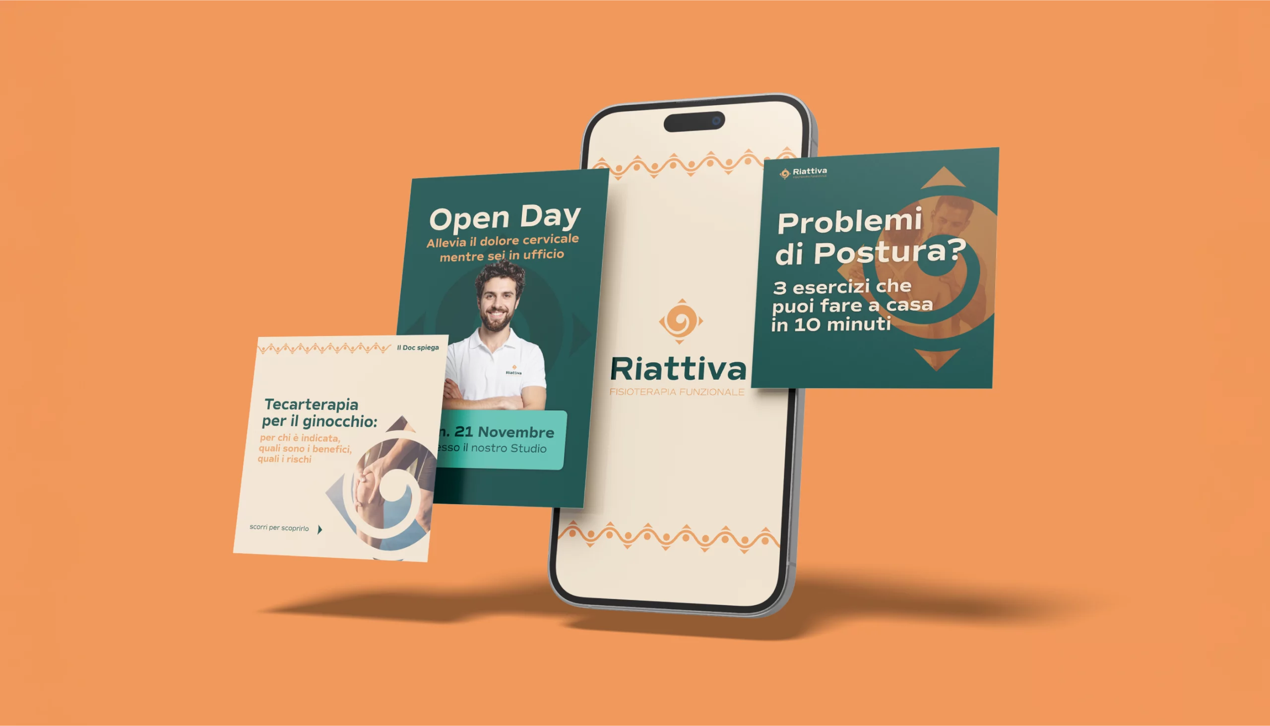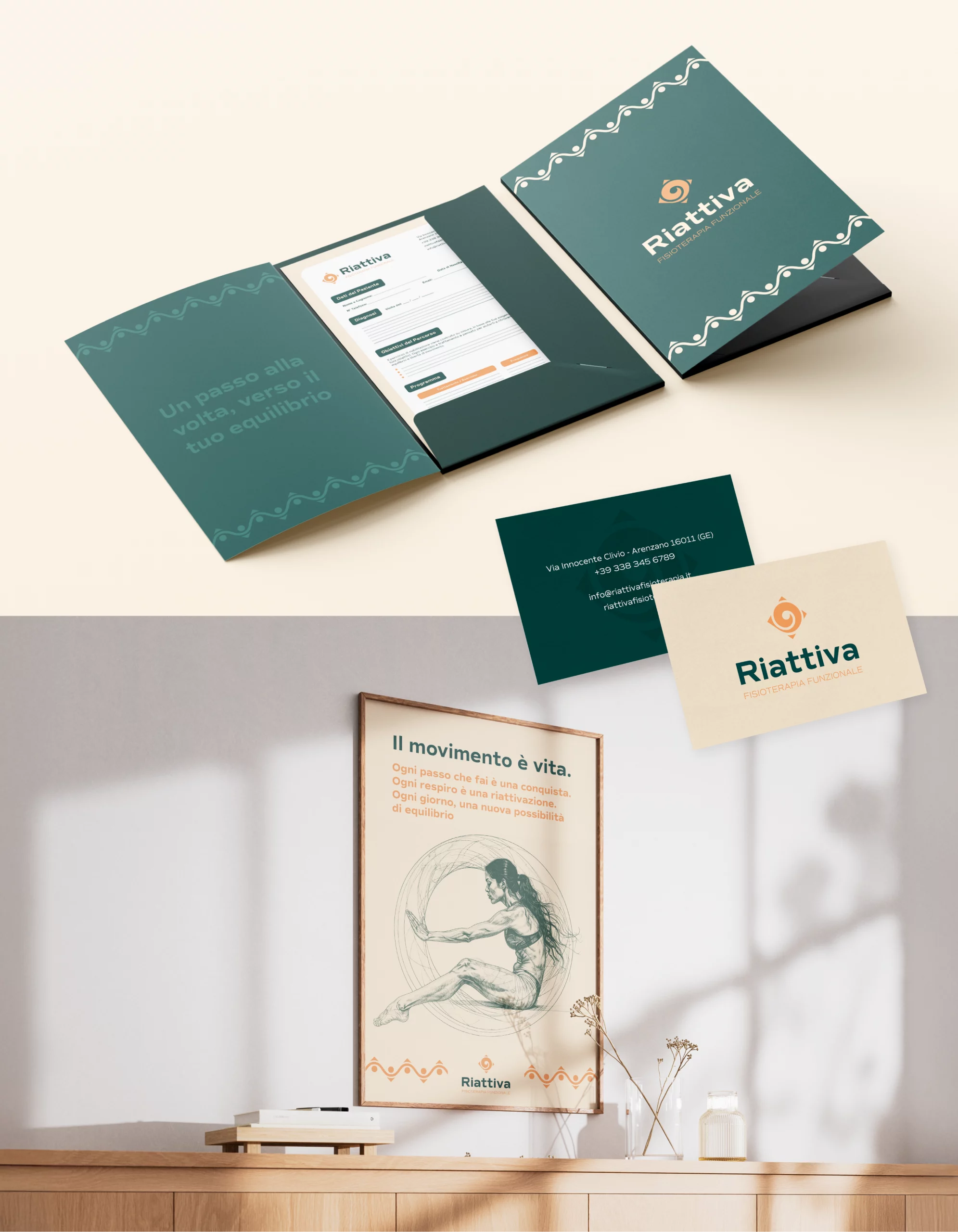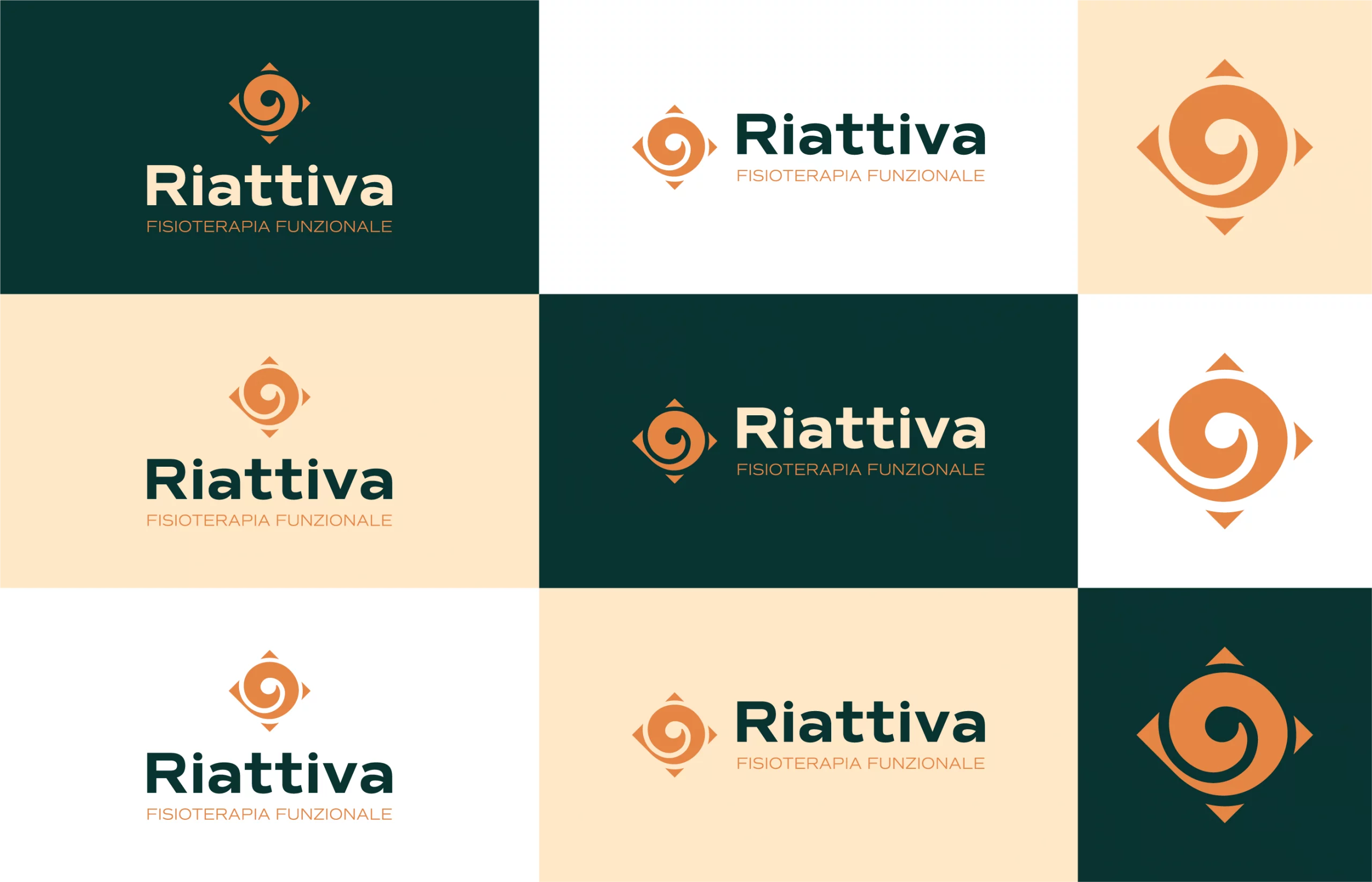 This is a personal concept developed from scratch. Riattiva – Fisioterapia Funzionale was created with the goal of portraying physiotherapy as a journey of rebirth and body awareness, rather than a simple medical treatment. The visual identity is built around the idea of controlled and harmonious movement, of energy that regenerates, restoring physical and mental balance – moving beyond the traditional medical stereotype. The project aims to convey trust, vitality, and expertise through a visual language that combines warm, natural tones with fluid and balanced forms. Every element — from the spiral symbol to the color palette – reflects the philosophy of a practice that guides patients in regaining strength, stability, and freedom of movement.