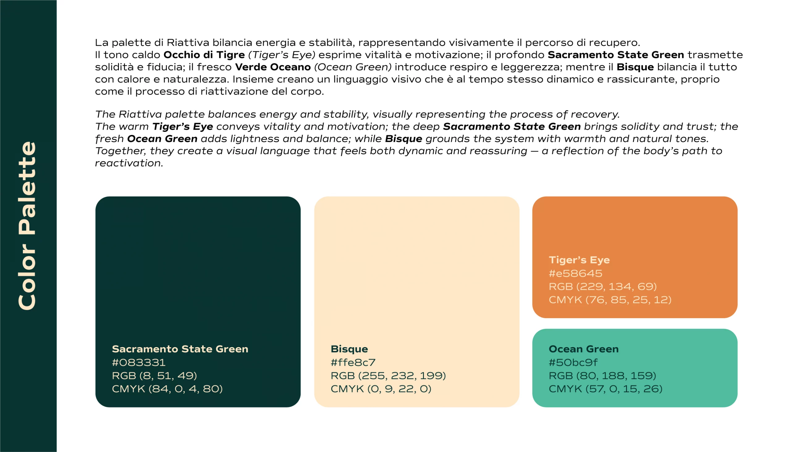 Questo è un concept personale sviluppato ex novo. Riattiva – Fisioterapia Funzionale nasce con l’obiettivo di rappresentare la fisioterapia come un percorso di rinascita e consapevolezza del corpo, più che come semplice trattamento medico. L’identità visiva è costruita intorno all’idea di movimento controllato e armonico, di energia che si rigenera, restituendo alla persona il proprio equilibrio fisico e mentale – andando al di fuori del classico stereotipo sanitario. Il progetto mira a trasmettere fiducia, vitalità e competenza, con un linguaggio visivo che unisce toni caldi e naturali a forme fluide e bilanciate. Ogni elemento – dal pittogramma spiralico alla palette cromatica – riflette la filosofia di uno studio che accompagna il paziente nel ritrovare forza, stabilità e libertà di movimento.